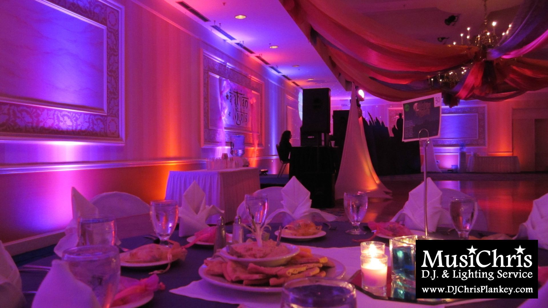 The color scheme was carefully coordinated with the ceiling draping installed by the Prom Committee. Alternating orange and purple uplighting was the dominant effect.
