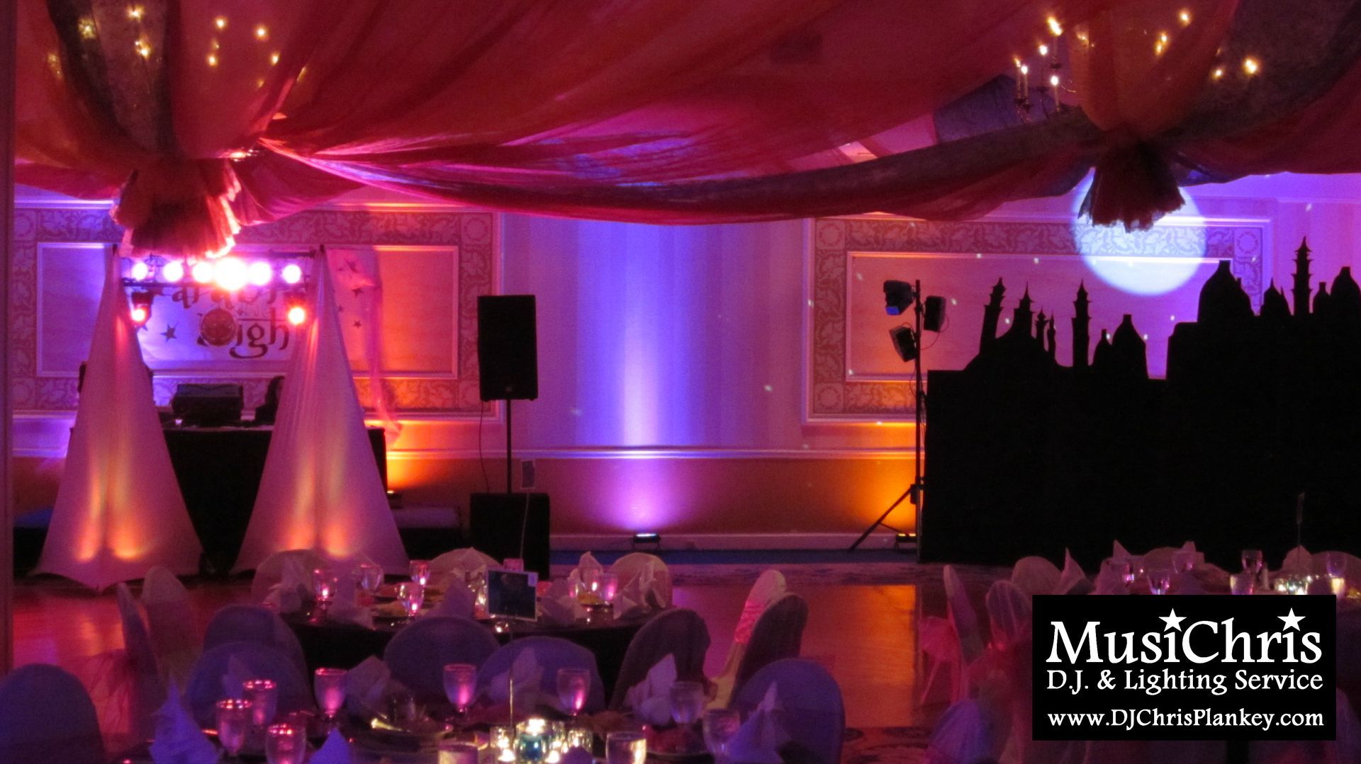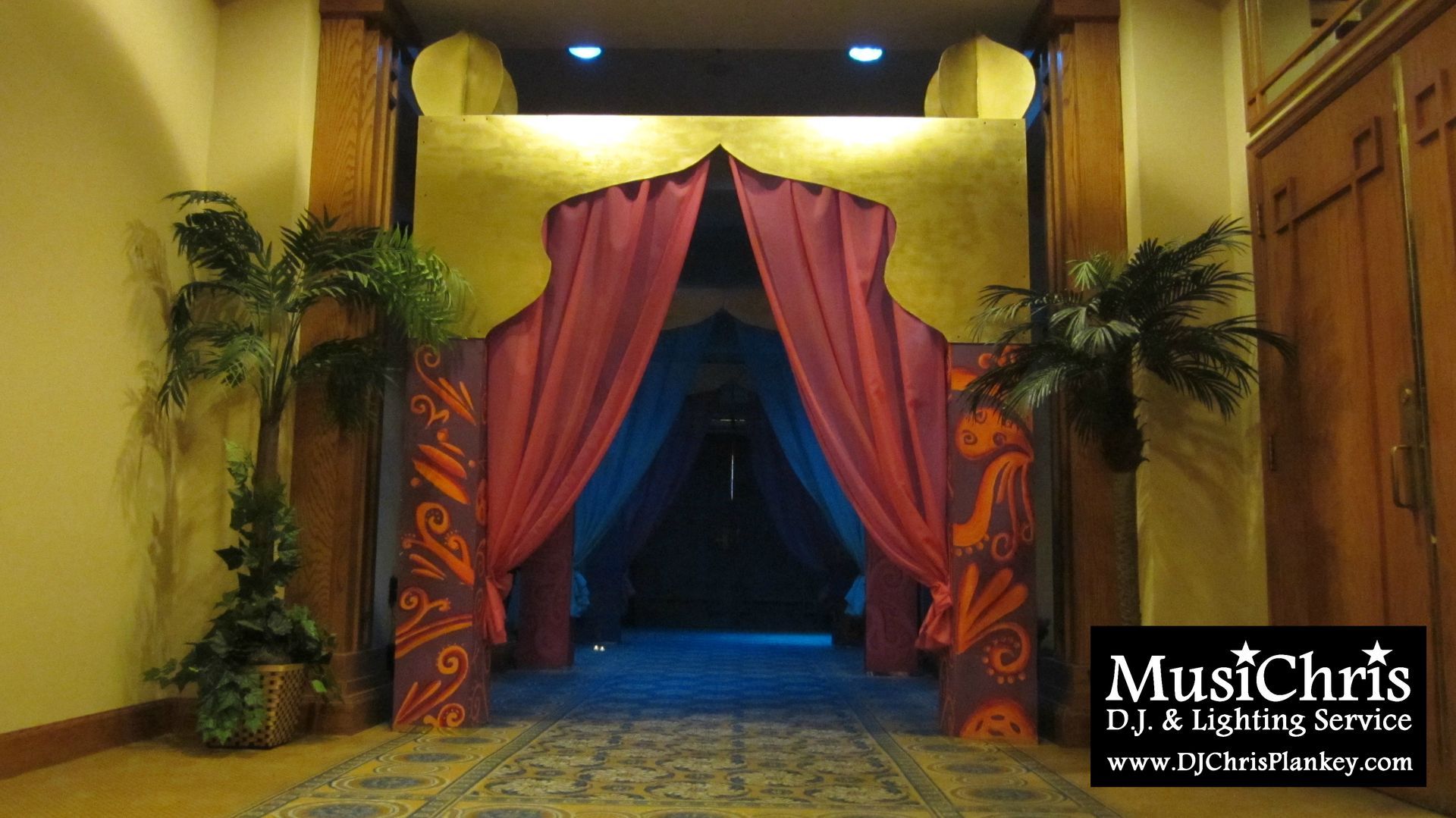 Promgoers were greeted by this Arabian skyline. I provided the stars, moon, and colorful lighting for this 2 dimensional skyline.