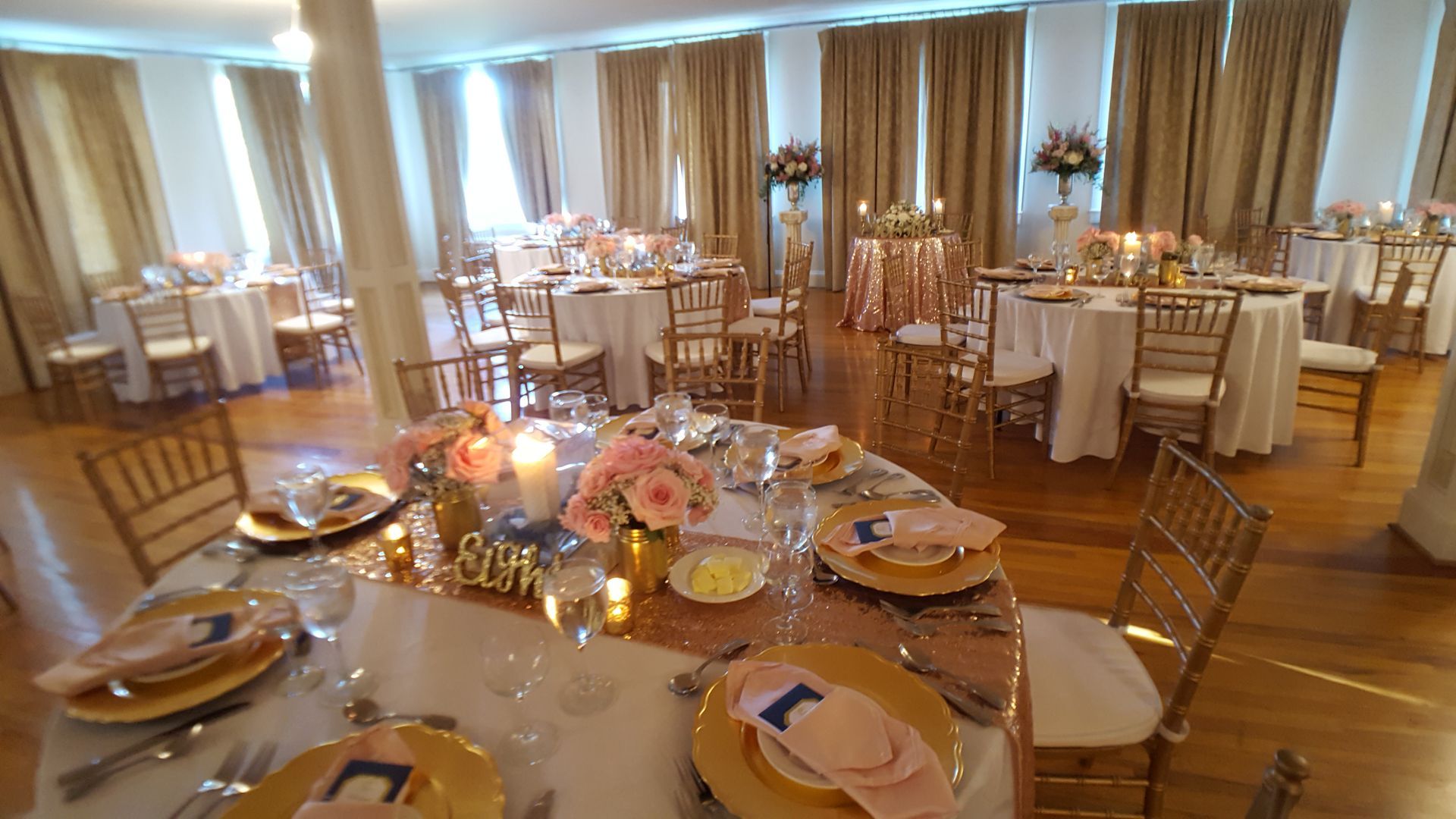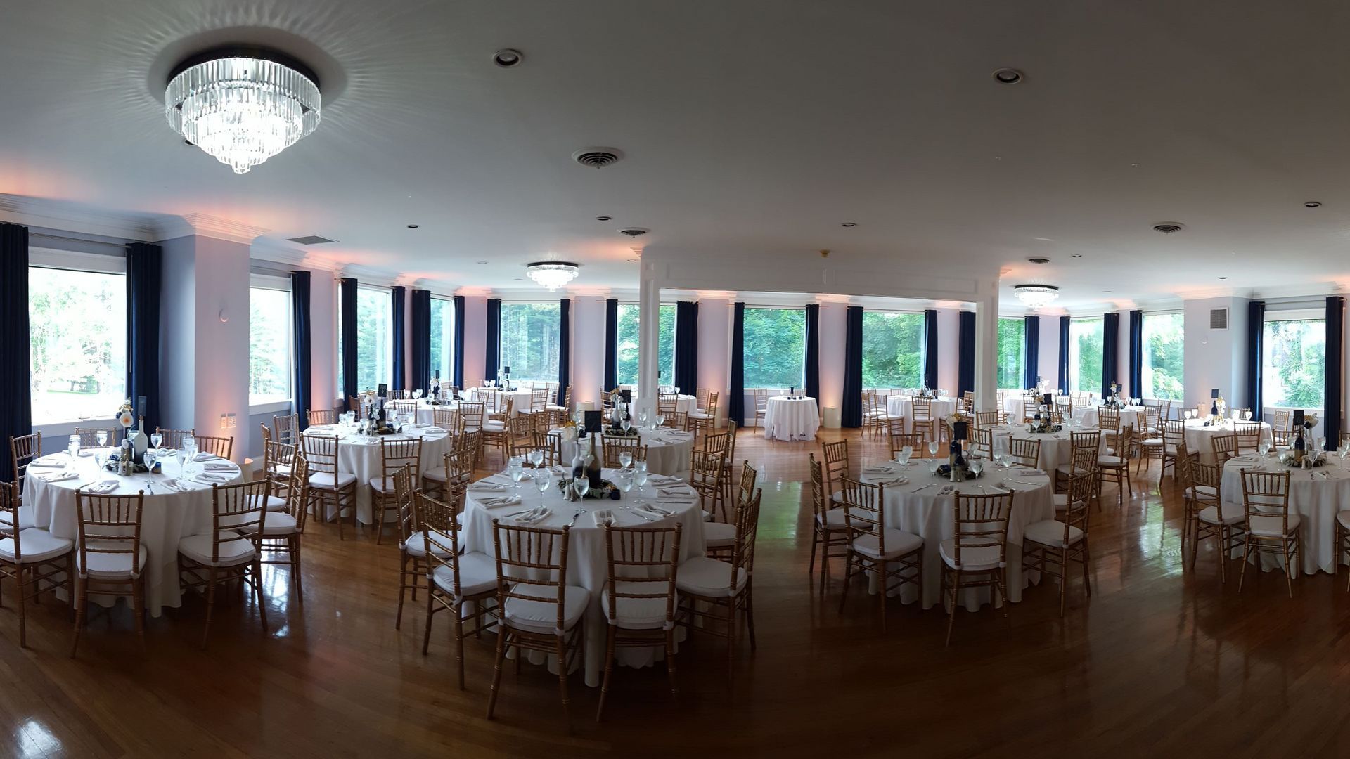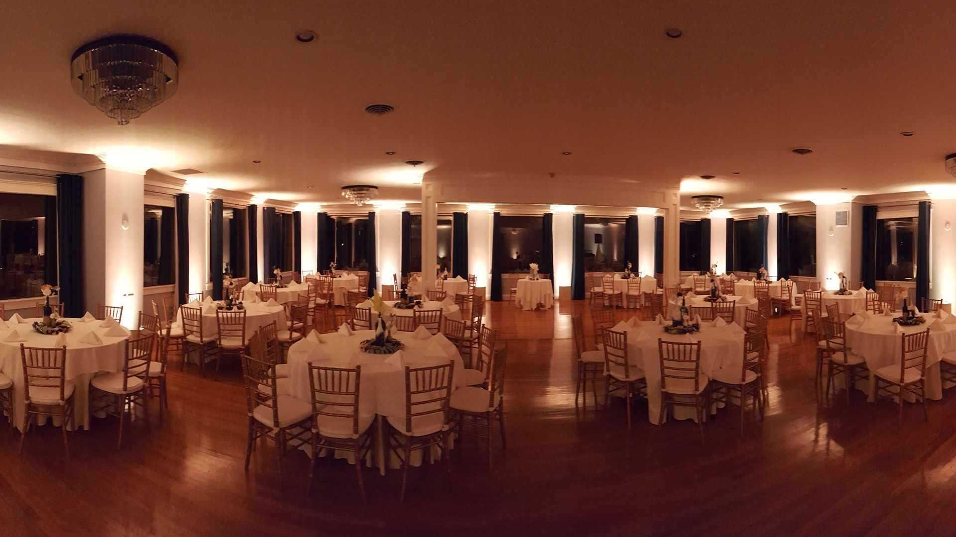 - indoors in the ballroom, sometimes with a dedicated bar there, other times guests grab drinks from the bar in the music room